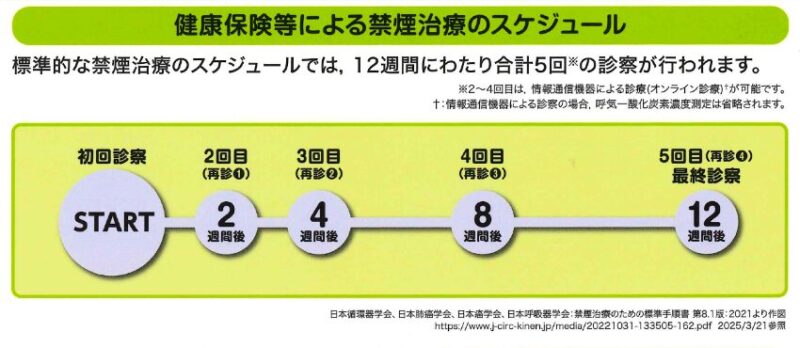 標準的な禁煙治療スケジュールは、初回受診後、2回目が2週間後、3回目が初回から4週間後、4回目が初回から8週間後、5回目が初回から12週間後となります。計5回の受診スケジュールとなります。