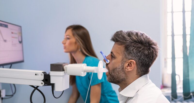 主に喫煙を原因とする気道・肺の慢性疾患で、労作時(階段・坂道など)の息切れが典型的な症状です。自覚症状が出た時点ですでに肺機能が低下していることが多く、早期発見が重要です。日本呼吸器学会によれば、COPDは国内に500万人以上の患者がいるとされていますが、そのうち診断・治療を受けているのはごく一部に留まっています。